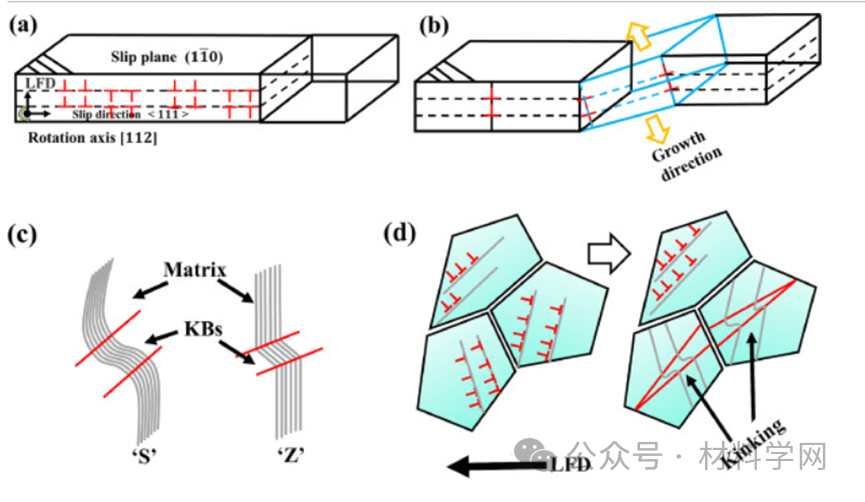 图5 扭结变形机理的详细解释,(a)结合图2(a)中I.区的KBs,显示了扭结的3个必要条件;(b) 扭结的激活;(c)'S'型扭结变形表示晶格旋转模式,“Z”型扭结变形表示均匀剪切模式;(d)观察扭结变形的宏观角度。