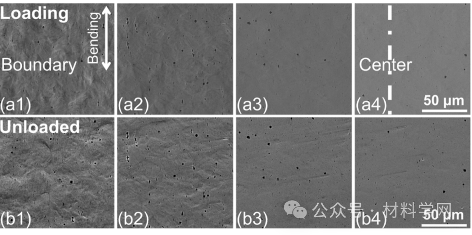 图 9. 原位 SEM-BSE 图像。三点弯曲下 GCR30 样品的最大应变位置:(a)加载和(b)卸载状态。(a1-a4)图 S7(a)中红色虚线方框标记的不同位置的四张放大 SEM-BSE 图像:(a1)边界,(a2、a3)中间区域和(a4)中心区域;同样,图 S7(b)中蓝色虚线方框标记的(b1-b4)也是在卸载后。