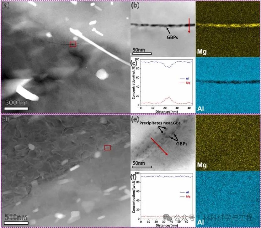 图8. 不同状态AA5083合金敏化后晶界附近的TEM结果