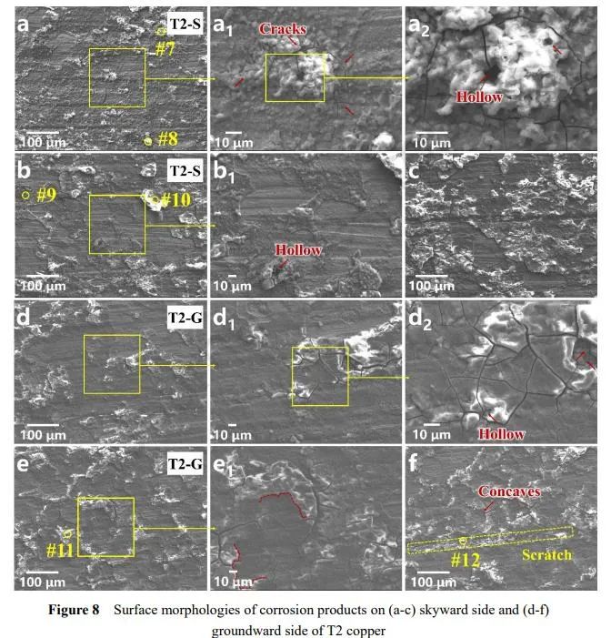 使用SEM对具有双层结构的T2铜腐蚀产物的微观形貌进行仔细观察,得出了一些值得注意的观察结果。蓝绿色薄膜上出现了大量的裂纹,在T2-S上有些区域的薄膜已经大量脱落,如图8(a-c)所示。值得注意的是,腐蚀产物没有形成具有规则几何形状的晶体,并且在两侧观察到局部腐蚀,如图8(a2)、(b1)和(d2),以及明显的空洞状形态,腐蚀产物覆盖了“洞穴”的边缘,细小颗粒在其中坍塌。