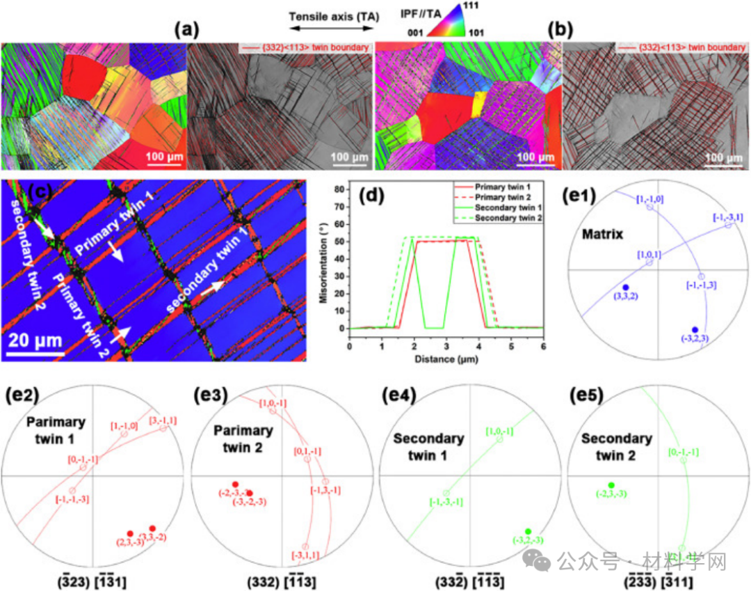 图9.TiZrHfNb0.55和TiZrHfNb0.6合金在77K下10 %拉伸应变后的微观组织:( a , b)IPFs和TiZrHfNb0.55和TiZrHfNb0.6合金的孪晶界能带对比图;( c ) ( a )中扩大了晶粒的视野;( d )沿( c )中线的取向差剖面;( e1-e5 )为BCC基体与初生孪晶变体和次生孪晶变体的赤平投影图。