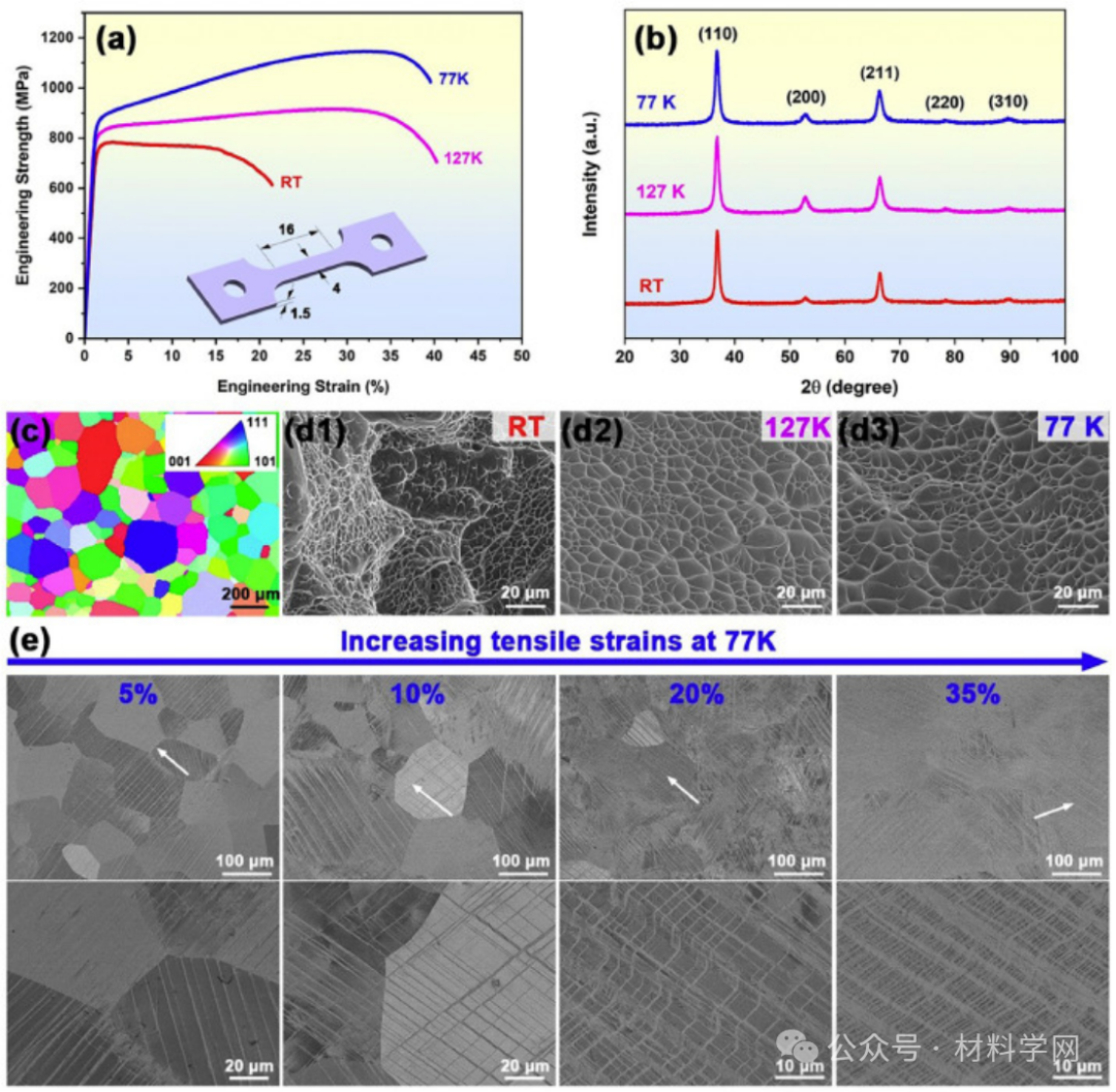 图1 . Ti Zr Hf Nb0.5合金的显微组织和拉伸性能:( a )拉伸试样的工程拉伸应力-应变曲线,( b )室温( RT )、127 K和77 K下的X射线衍射( XRD )图谱;( c )初始再结晶组织;( d1 ~ d3 )分别为室温、127 K和77 K下的断口形貌;( e ) 77 K下拉伸应变从5 %增加到35 %时( BSE )图像下的变形子结构。