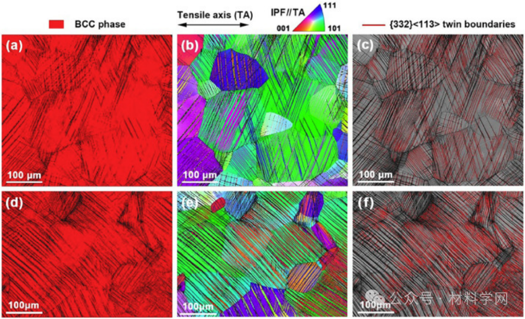 图2 . Ti Zr Hf Nb0.5合金在77 K:( a , d)相图中经过( a-c ) 10 %和( d-f ) 20 %拉伸应变后的变形组织;( b , e)的逆极图( IPF )和( c , f)的能带对比图与{ 332 }孪晶界重叠。