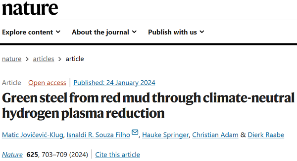 原文详情:Jovičević-Klug, M., Souza Filho, I.R., Springer, H. et al. Green steel from red mud through climate-neutral hydrogen plasma reduction. Nature 625, 703-709 (2024). https://doi.org/10.1038/s41586-023-06901-z