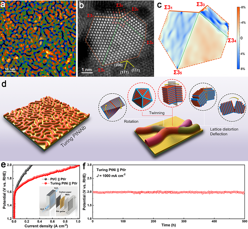 图5 超纳图灵纳米催化剂 (a)图灵PtNiNb催化剂的HAADF-STEM图像;(b)图灵PtNiNb催化剂中的五重孪晶;(c)图灵催化剂的孪晶晶格应变分析;(d)图灵催化剂及其晶体学特征的示意图;(e)集成了图灵PtNiNb催化剂的AEM器件的LSV曲线;(f)AEM器件在1A/cm2电流密度下表现出极高的催化剂稳定性。