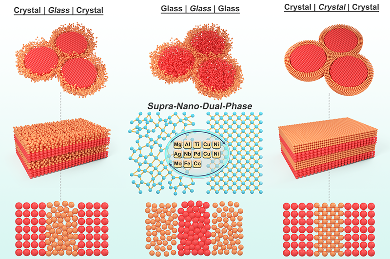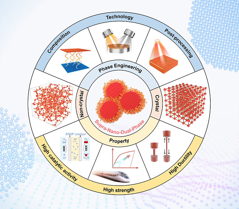 纳米尺度已被证明是在设计微观结构和组织相时打破宏观/微观限制并提升材料性能的一个维度自由度。随着纳米材料领域的巨大进步和纳米材料库的丰富,许多新效应和新现象得到了广泛的报道,例如反Hall-Petch关系和量子隧道效应。这些发现表明,尺寸在1到100纳米的结构/相具有本质上不同的物理化学特性,这也激发了科学家对进一步细分纳米材料的兴趣。2017年,吕坚院士首次提出了超纳概念,定义了结构/相尺寸在1到10纳米范围内的材料。超纳材料的超细结构单元,会影响整个材料的短程和中程序结构,并可以通过相工程以可控的方式进行操纵。通过超纳结构设计,已经实现了许多非凡的性能,如近理论强度(3.3 GPa)的超纳双相(SNDP)玻璃-晶体镁合金,近理论硬度(10.8 GPa)的层状超纳双相Zr/Nb合金和高活性Al-Mn-Ru催化剂。这些新发现表明,具有独特原子配位的超纳结构呈现明显的多相交互作用和界面效应,可以实现高强度/大延性以及优异的催化性能,因此是纳米结构金属材料相工程的新范例。