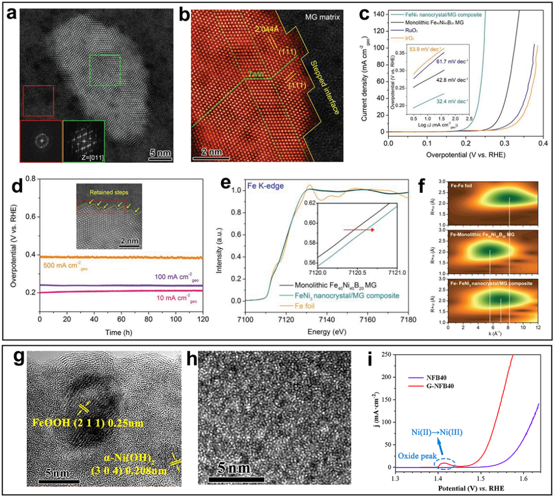 图7 (a)(b)Fe-Ni-B超纳双相催化剂的HRTEM图像;(c)Fe-Ni-B超纳双相催化剂的OER性能;(d)Fe-Ni-B超纳双相催化剂在不同电流密度下的稳定性测试,插图是稳定性测试后的TEM图像;(e)Fe-Ni-B超纳双相催化剂的XANES图谱;(f)镍边的小波变换图像;(g)Ni-Fe-B超纳双相催化剂的HRTEM图像;(h)Ni-Fe-B超纳双相催化剂非晶区域的高分辨图像;(i)Ni-Fe-B超纳双相催化剂的OER性能。