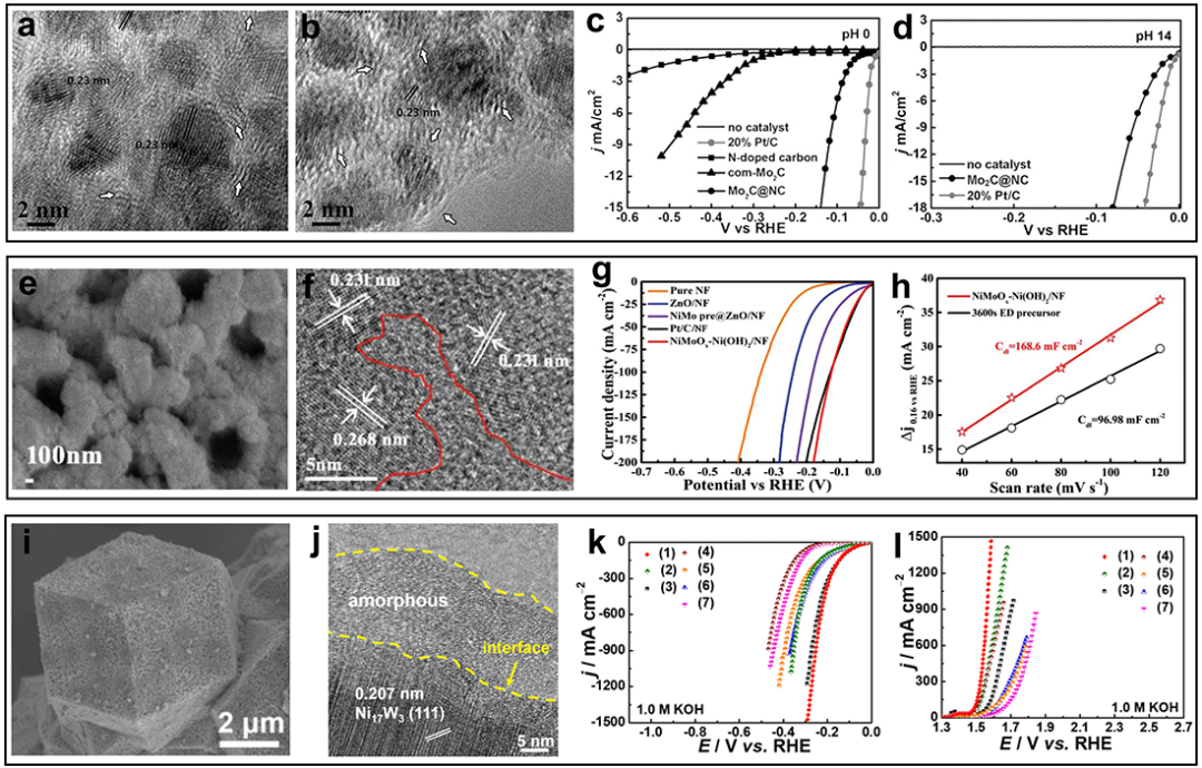 图6 超纳图灵纳米催化剂 (a)(b)Mo-C超纳双相催化剂的TEM图像;(c)(d)Mo-C超纳双相催化剂在不同pH值环境下的HER性能;(e)(f)镍基超纳双相催化剂的形貌和TEM图像;(g)镍基超纳双相催化剂在碱性环境中的HER性能;(h)镍基超纳双相催化剂的电化学双电层电容数值;(i)(j)W-Ni基超纳双相催化剂的形貌和TEM图像;W-Ni基超纳双相催化剂在碱性环境中的HER性能(k)和OER性能(l)。