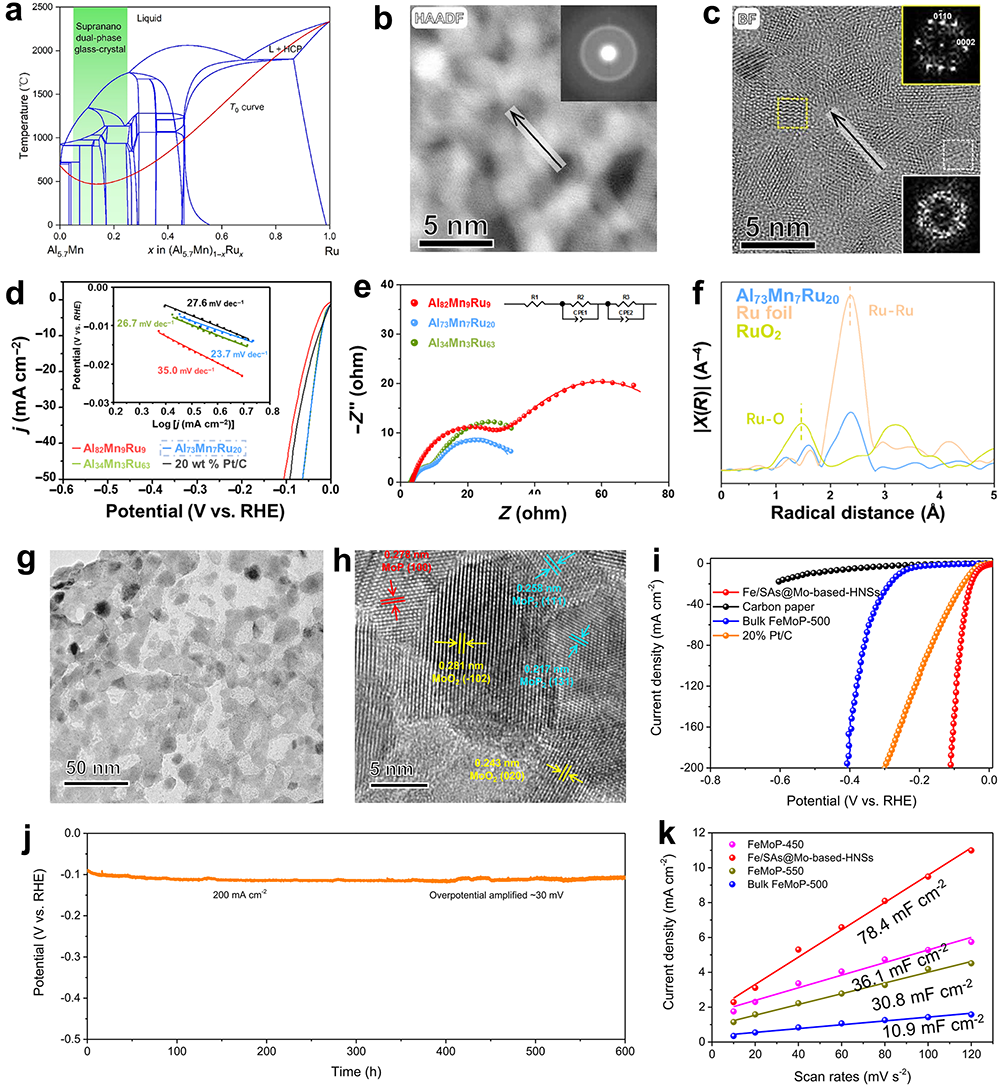 图4 超纳双相纳米催化剂 (a)通过热力学计算对Al-Mn-Ru超纳双相体系进行计算;(b) Al-Mn-Ru超纳双相催化剂的HAADF图像;(c)Al-Mn-Ru超纳双相催化剂的STEM图像;(d)Al-Mn-Ru超纳双相催化剂在碱性环境中的LSV曲线;(e)催化剂的Nyquist图;(f) EXAFS表征Al-Mn-Ru超纳双相催化剂的精细结构;(g)Fe-Mo超纳双相矿物质水凝胶的形貌特征;(h)Fe-Mo超纳双相矿物质水凝胶的HRTEM图像;(i)Fe-Mo超纳双相矿物质水凝胶在碱性环境中的LSV曲线;(j)催化剂的稳定性测试曲线;(k)电化学双电层电容。