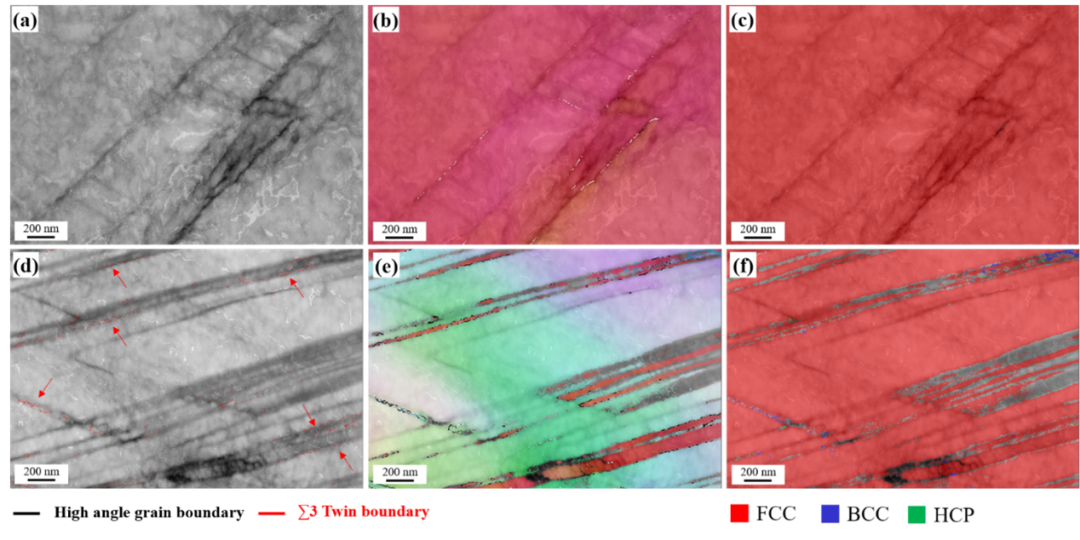 本文研究了CrMnFeCoNi合金与316LN不锈钢异种激光焊接接头的显微组织和力学性能。系统分析了不同变形温度下焊缝中的显微组织演变对力学性能的影响规律及其微观机理。焊接接头的室温和低温抗拉强度均能达到母材强度的90 %以上,为未来高熵合金作为低温结构材料应用于核聚变超导磁体、氢能源以及航空航天领域提供了基础数据和理论支撑。目前,316LN奥氏体不锈钢由于具有优异的综合力学性能被选为国际热核聚变实验堆(ITER)项目中的结构材料。然而,随着核聚变超导磁体磁体系统的不断升级,将需要具有更高强度和韧性的低温结构材料来抵抗施加在铠甲及其超导材料上的强大电磁力。高熵合金(HEA)具有卓越的机械性能(高强高韧),使其成为在低温下使用的潜在候选结构材料,以承受超导磁体服役期间产生的洛伦兹力施加的高应力。另一方面,考虑到加工周期和成本,在大型超导磁体结构设计过程中,高应力区域部件将选择具有较高强度和韧性的结构材料,低应力区域将使用316LN等奥氏体不锈钢材料。因此,有必要在部件的制造过程中开展316LN和高熵合金之间的可靠焊接工艺研究。本工作旨在研究316LN/高熵合金异种焊接接头的微观组织演变及低温力学性能,推动高熵合金材料在大科学装置及氢能源等领域的工程化应用。松山湖材料实验室王维研究员与中科院理化所李来风研究员团队(杨潇副研究员)以及南昌航空大学王善林教授等单位科研人员合作,通过研究CrMnFeCoNi合金与316LN异种激光焊接接头在塑性变形过程中的组织演变发现,室温条件下焊缝的变形组织主要由位错、层错和变形孪晶组成,孪生和位错滑移相互竞争、相互促进,共同实现材料的塑性变形。当变形温度降低至77K时,变形孪晶的体积分数逐渐增大,位错滑移显著受到抑制,变形孪晶的形成主导了塑性变形过程。此外,低温条件下并未发现马氏体转变。获得的优异焊接接头力学性能,将提高高熵合金作为聚变反应堆、氢能源以及航天航天等领域结构材料应用的潜力。相关研究成果以“Dissimilar laser welding of CrMnFeCoNi high entropy alloy and 316LN stainless steel for cryogenic application”为题,发表在《Journal of Materials Science & Technology》上。图1 焊接接头的SEM图:(a)焊接接头宏观形貌,(b)EDS线扫描的元素分布图,(c)316LN侧熔合线附近的EDS图,(d)CrMnFeCoNi侧熔合线附近的EDS图,(e)熔合区中心的ESD图。图2 焊接接头的EBSD图:(a)和(b)反极图(IPF),(c)晶界分布图,(d)KAM图,(e)和(f)相图,(g)晶界取向差图。图3焊接接头中316LN、焊缝区和高熵合金不同区域的XRD图。图4 焊缝区域的TEM图:(a)TEM-BF图,(b)SAED图,显示单相FCC结构,(c)和(d)晶界和晶粒内部的HRTEM图(带FFT图)。图5 焊接接头的拉伸性能:(a)室温和77K的应力-应变曲线,(b)室温下断口SEM图,(c)77K断口SEM图,(d)颗粒的EDS分析。图6 纳米压痕测试:(a)焊接接头的硬度分布图,(b)和(c)两侧熔合线附近的典型载荷-位移曲线。图7 焊接接头断口附近的EBSD图:(a)室温IPF图,(b)室温放大BC图,(c)室温KAM图,(d)室温相图,(e)77 K IPF图,(f)77 K放大BC图,(g)77 K KAM图,(h)77 K相图。图8 室温下断口附近变形组织的TEM图:(a)变形亚结构,(b)图8(a)放大图显示变形亚结构,(c)变形带的HRTEM图(带FFT插图),(d)图8(c)的反傅里叶变换图(IFFT)。图9 77K下断口附近变形组织的TEM图:(a)变形亚结构,(b)图9(a)放大图显示变形亚结构(带FFT插图),(c)和(d)图8(b)的反傅里叶变换图(IFFT)。图10 断口附近TEM样品的TKD图:(a)室温BC图,(b)室温IPF图,(c)室温相图,(d)77K BC图,(e)77K IPF图,(f)77K相图.本文系统研究了CrMnFeCoNi高熵合金与316LN奥氏体不锈钢异种激光焊接接头在室温和低温下的显微组织与力学性能。利用SEM,XRD,EBSD和TEM等技术分析了塑性变形过程中的微观结构演变对力学性能的影响。结果表明,焊接接头的室温和低温抗拉强度均能达到母材强度的90 %以上。在77K低温塑性变形过程中,孪晶主导了变形过程,并未发现马氏体转变。未来实现高熵合金性能的更大提升,以及优化焊接工艺参数,获得优质的焊接接头并对异种接头4.2K条件下的显微组织演变规律和力学性能的相关性开展深入研究,这将有利于推动高熵合金在低温工程中的实际应用。论文地址:Jijun Xin, Wei Wang, Xiao Yang, Mebrouka Boubeche, Shanlin Wang, Hengcheng Zhang, Chuanjun Huang, Yong Li, Bingkun Lyu, Fuzhi Shen, Wentao Sun, Laifeng Li, Dissimilar laser welding of CrMnFeCoNi high entropy alloy and 316LN stainless steel for cryogenic application, J. Mater. Sci. Technol. 163 (2023) 158-167.王维,松山湖材料实验室实用超导研究团队研究员,博士生导师,广东省重大人才工程青年拔尖人才,中国船舶军民融合发展研究中心智库专家,广东省高层次人才评审专家,东莞市特色人才,材料人网2023年度优秀青年科学家。长期致力于实用超导相关低温材料与系统研发。主持了科技部重点研发计划课题、国家自然科学基金面上、粤莞联合基金重点项目、广东省JMRH专项资金等国家、省部级横纵向项目20余项。Microstructures,金属学报期刊青年编委,在Adv. Mater.,J. Mater. Sci. Technol., Scripta Mater. 和Mater. Des.等学术期刊上发表论文56篇,受理/授权专利14项。杨潇,中科院理化所副研究员。近年来,主持纵向国家、地方纵向科研项目/课题和科学院科研项目7项,横向技术开发项目4项。获省部级学术奖励2次。参编并出版高熵合金材料方向科研专著1部。主要从事高熵材料的设计、研发及产业化应用研究,已在Journa