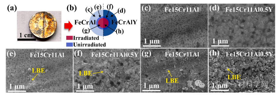 该团队根据前期发表于《Surface & Coatings Technology》、《Corrosion Science》等期刊上的FeCrAl涂层研究实验结果,采用磁控溅射工艺在F/M钢基体表面以巧妙的两步沉积法工艺分别制备了6μm厚的FeCrAl和FeCrAlY涂层(图1)。SRIM理论计算结果表明,5.5MeV质子束在钢基体和涂层中的穿透深度约为110μm,总厚度为91μm的钢基体-涂层样品可规避布拉格峰。涂层与LBE的接触区域直径为5mm,辐照影响区域的直径为3mm。因此,涂层同时包含了未辐照-腐蚀区域与辐照-腐蚀耦合区域。实验中,LBE腐蚀时间约为40h、辐照时间约为17h。通过对未辐照-腐蚀区域涂层以及辐照-腐蚀耦合区域微观结构的分析,详细揭示了FeCrAl涂层微观结构与耐蚀性能演变的微观机理。