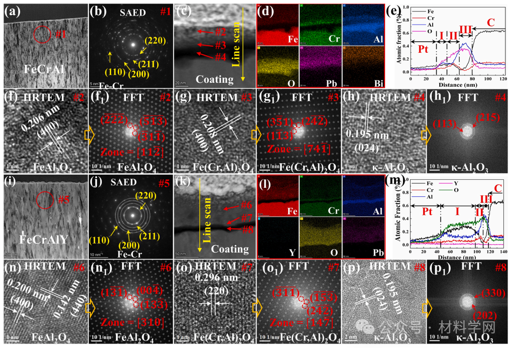 图 4 未辐照-腐蚀区域FeCrAl和FeCrAlY涂层表面腐蚀层结构分析。(a)和(i)未辐照-腐蚀区域FeCrAl和FeCrAlY涂层截面形貌;(b)和(j)未辐照-腐蚀区域FeCrAl和FeCrAlY涂层晶体结构;(c)-(e)和(k)-(m)未辐照-腐蚀区域FeCrAl和FeCrAlY涂层表面腐蚀层元素分布;(f)-(h1)和(n)-(p1)未辐照-腐蚀区域FeCrAl和FeCrAlY涂层表面腐蚀层结构分析。