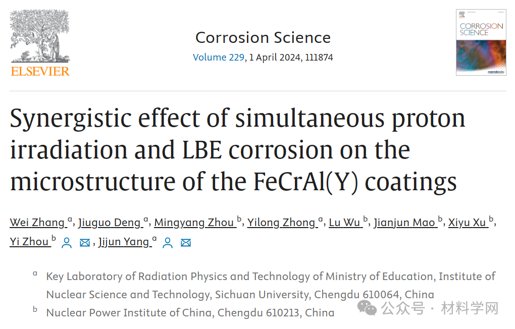 近日,四川大学原子核科学技术研究所团队联合中国核动力研究设计院研究团队,基于自主开发的HVE 3MV直线串列加速器材料辐照终端,在国际上首次开展了耐LBE腐蚀涂层的质子辐照-铅铋腐蚀原位耦合实验研究。相关工作以“Synergistic effect of simultaneous proton irradiation and LBE corrosion on the microstructure of the FeCrAl(Y) coatings”为题发表于材料腐蚀研究顶刊《Corrosion Science》上,博士研究生张伟为第一作者,四川大学原子核科学技术研究所(720所)杨吉军研究员与中国核动力研究设计院周毅研究员为共同通讯作者。