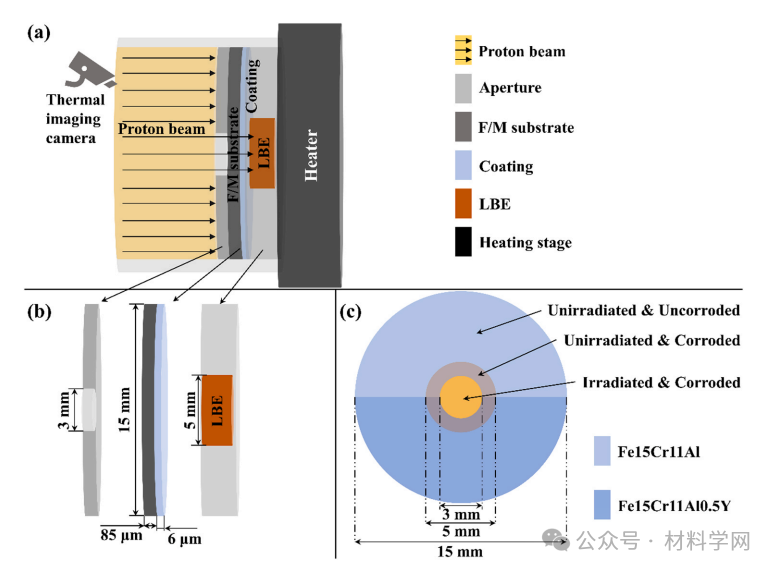图 1 同时辐照腐蚀试验装置原理图。(a)和(b)直径3mm的质子束穿过F/M钢基体和涂层并使辐照损伤的布拉格峰分布于LBE中。(c)薄钢基体表面一半区域为FeCrAl涂层一半区域为FeCrAlY涂层。样品中心黄色区域为同时辐照腐蚀区域,橙色区域为未辐照-腐蚀区域。