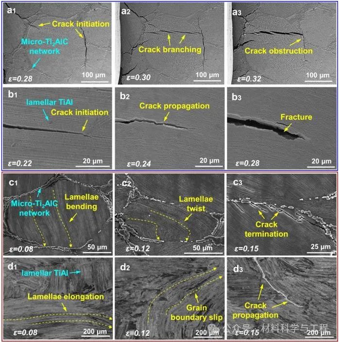 (a1)~(a3)复合材料在室温压缩变形下的微观组织演变;(b1)~(b3) TiAl合金在室温压缩变形下的微观组织演变;(c1)~(c2)复合材料在高温压缩变形下的微观组织演变;(d1)~(d3) TiAl合金在高温压缩变形下的微观组织演变
