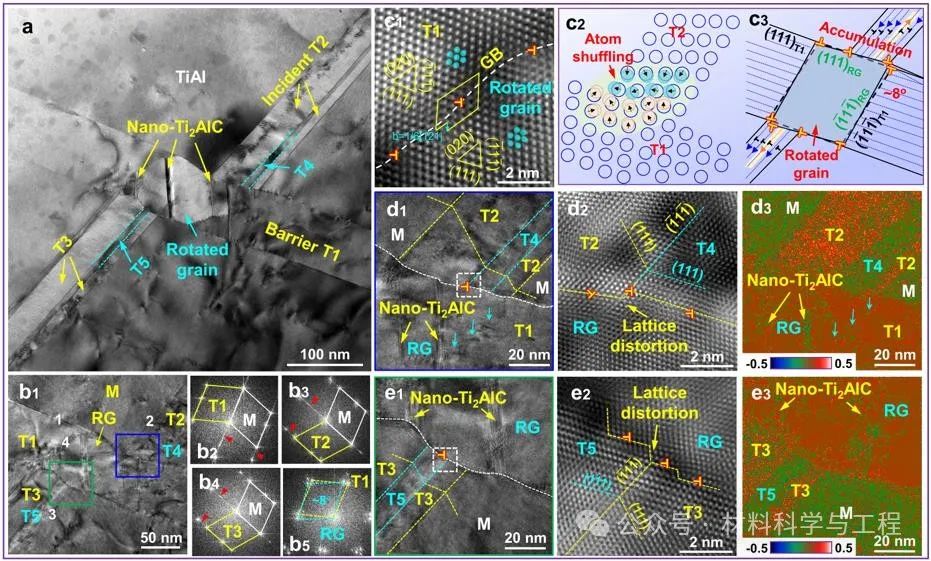 (a) TiAl基体中变形孪晶交互和纳米Ti2AlC作用的TEM图像;(b1)~(b5) 变形孪晶交互的HRTEM图像;(c1)~(c3) 转动晶粒的IFFT图像及形成示意图;(d1)~(d3) 图5(b1)中蓝色区域的TEM图像和GPA应变图;(e1)~(e3)图5 (b1)中绿色区域的TEM图像和GPA应变图