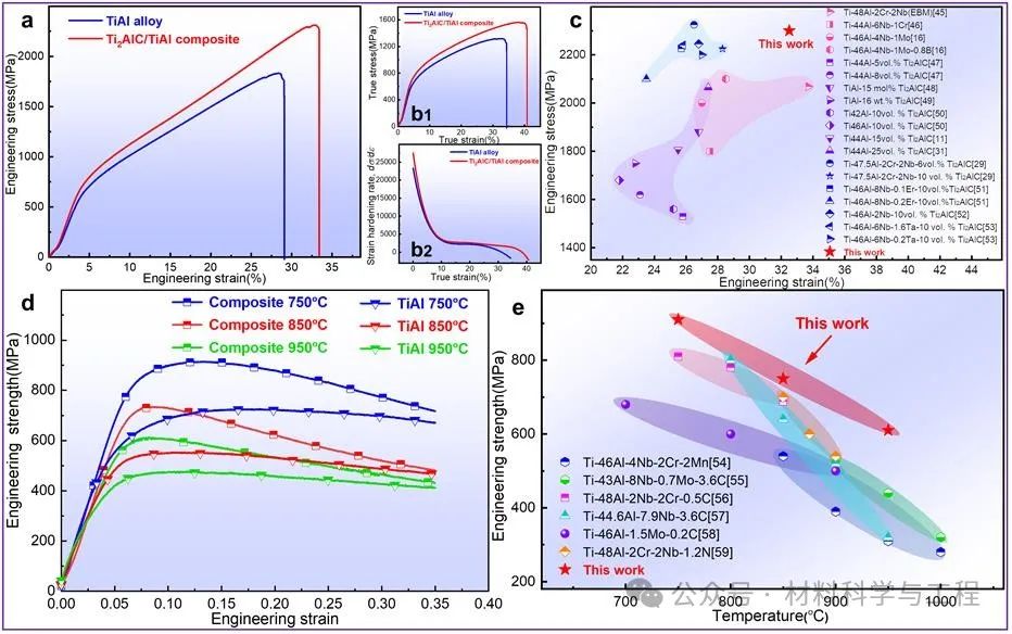 (a) 室温工程应力应变曲线;(b1)~(b2) 真应力应变曲线及相应的应变硬化率曲线;(c) 多级异构Ti2AlC/TiAl复合材料与其他TiAl合金及复合材料的室温压缩性能对比;(d) 高温工程应力应变曲线;(e) 多级异构Ti2AlC/TiAl复合材料与其他TiAl合金及复合材料的高温压缩性能对比