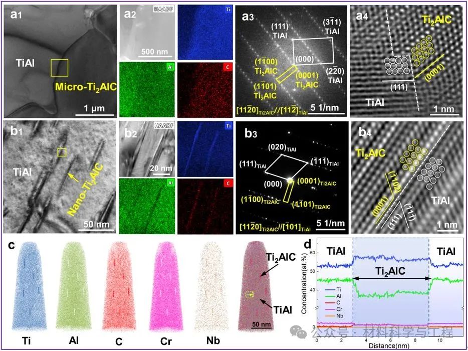 (a1)~(a4) 微米Ti2AlC和TiAl基体界面的TEM图像、界面位向关系及原子结构;(b1)~ (b4) 纳米Ti2AlC和TiAl基体界面的TEM图像、界面位向关系及原子结构;(c)~(d) 纳米Ti2AlC的3D-APT原子重构图及元素分布图
