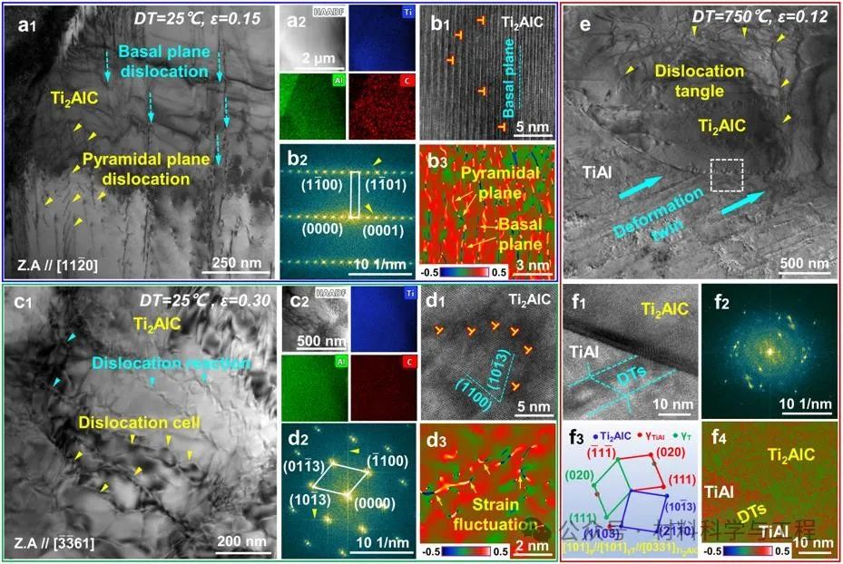 (a1)~(b3) 微米Ti2AlC室温压缩过程中产生基面位错与锥面位错的TEM图像和GPA应变图;(c1)~(d3)微米Ti2AlC中室温压缩过程中由位错反应引起位错胞形成的TEM图像和GPA应变图;(e)~(f4) 微米Ti2AlC高温压缩过程中位错缠结和界面孪晶受阻的TEM图像和GPA应变图