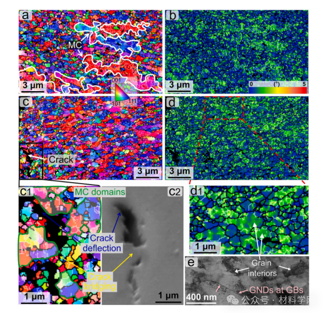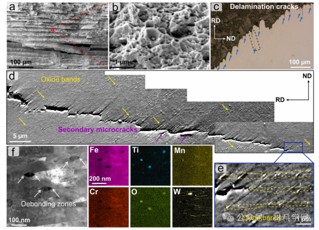 它们的优越性能通常归因于热稳定的纳米沉淀物(NPs)和高分率晶界(GBs),它们既是位错运动的强大屏障,又是捕获辐射产生的缺陷。然而,这种机械强度的提高是以牺牲延展性和断裂韧性为代价的 [11,12]。研究发现,高强度 NFA 的室温(RT)总伸长率(屈服强度接近约 1.5 GPa)总是低于 5%。例如,橡树岭国家实验室开发的最先进的超强 14YWT NFA(屈服强度约为 1.6 GPa)从 RT 到 500 ◦C 的总伸长率极其有限,不到 2.5 % 。要将这些先进的高强度非氟烷烃实际应用于核反应堆堆芯结构部件,就必须提高其延展性。事实证明,异质结构设计在解决强度-电导率权衡难题方面大有可为。在异质结构材料中,软(粗晶粒)区和硬(细晶粒)区之间的不相容变形可产生界面应变梯度,激活所谓的异质变形诱导硬化,从而提高应变硬化和延展性。虽然已经开发出了一些异质结构 ODS 钢 [11,17],但传统的异质结构策略可能并不是设计韧性 ODS 钢的最佳方法。一方面,无软性分散的粗粒域与硬性分散致密的细粒基体之间巨大的机械反差很容易引起界面解粘,从而降低延展性和断裂韧性,而不是增强韧性[18]。另一方面,在高剂量辐照和高温应力等苛刻条件下,这些无分散软域很容易受到破坏,尤其是对于软域比例较高的合金。在这项工作中,燕山大学蔡学成教授团队通过机械合金化和两步固结工艺(即高压预烧结和随后的热轧)开发出了一种新型异质结构纳米铁素体合金(NLFA),它具有 2 GPa 的超高屈服强度和 ~ 13 % 的优异延展性。MC 域也含有高密度的 NPs,与 UFG 基体中 NPs 的分布相似。机械对比度的降低使相对较软的 MC 域能够通过局部塑性变形钝化微裂纹,而不会产生界面解粘。有趣的是,我们还发现在超高流动应力下,具有纳米级脱粘角的氧化物带可诱发大量层间裂纹,从而引发分层增韧过程。名义成分为 Fe-14Cr-3W0.4Ti-0.8Zr-0.3Y2O3(重量百分比)的掺锆 14YWT NLFA 是通过机械合金化方法制备的。高纯度元素铁、铬、钨、钛、锆粉末(Alfa Aesar,纯度 99.9%,- 200 目)和 Y2O3 纳米颗粒(Alfa Aesar,纯度 99.5%,平均粒径 20 纳米)的混合物,然后通过两步固结工艺制备而成。为了制备异质结构合金,将 100 克粉末混合物和 500 克淬火钢球置于充有氩气的手套箱内的不锈钢研磨瓶中,然后在 MiQi QM-QX2L 行星研磨机中以 300 转/分的转速进行低能球磨,持续 50 小时,以实现机械合金化。然后,采用高压烧结技术在 800 ◦C、4 GPa 的压力下对机械合金粉末进行 30 分钟的预烧结。对于均质合金,将 6 克粉末混合物和 48 克淬火钢球放入淬火钢研磨瓶中,然后在充有氩气的手套箱内的 SPEX 8000D 振动磨中以 1425 rpm 的转速进行 24 小时的高能球磨,从而进行机械合金化。然后,在 900 oC 和 4 GPa 下对机械合金粉末进行 30 分钟的预烧结。高压烧结的详细步骤已在我们之前的研究中作了介绍[10]。最后,这两种高压预烧结合金(以下称为 HPed 合金)在 800 ◦C 温度下进一步进行多道轧制,使总厚度减少约 85 %(以下称为 HRed 合金)。链接:https://www.sciencedirect.com/science/article/abs/pii/S135964622300670X图 1. 异质结构合金的微观结构。(a)粉碎合金粉末、HPed 合金和 HRed NLFA 的 XRD 图。(b)HPed 合金的 EBSD-IPF 和 (c) STEM-BF 图像。取向角在 2 o 和 15 o 之间的子边界用白色虚线标出。分别在垂直于 RD、TD 和 ND 的正交平面上扫描的 EBSD-IPF图(d)和相应的相图(e)重建的 HRed NLFA 三维立体微观结构。一些晶粒尺寸极小的黑色区域无法通过 EBSD 表征很好地识别。(f) HRed NLFA 的 RD-TD 平面上的晶粒尺寸分布。(g) 在 HRed NLFA 的 RD-ND 平面上扫描的 STEM-BF 图像。(h) 利用 FSD-SEM 地图重建的 HRed NLFA 三维立体微观结构,显示富 Mn-Ti-O- 氧化物的分布。给出了 IPF 和相图中使用的颜色代码。图 2.(a)HPed 异质结构合金、HRed 异质结构 NLFA 和 HRed 均质合金的代表性工程应力-应变曲线。插图中的 SEM 图像显示了 HPed 异质结构合金的断口形貌。(b) HRed 异质 NLFA 的维氏硬度随等速(1 小时)退火温度的变化,以及 HRed 异质 NLFA 在 700 ◦C 退火 1 小时后的工程应力-应变曲线。图 3. 拉伸测试前后 HRed 异质结构 NLFA 的微观结构。在 HRed NLFA 的 RD-TD 平面上扫描的 EBSD-IPF 图(a)和相应的 KAM 图(b)平面上扫描的 EBSD-IPF 图(a)和相应的 KAM 图(b)。EBSD-IPF 图(c)和相应的 KAM 图(d)在拉伸测试的 NLFA 的 RD-TD 平面上扫描,靠近断裂面。(c1)(c)方框区域的放大图,(c2)为相应的扫描电镜图像。(d1)(d)方框区域的放大图。(e)拉伸测试 NLFA 断裂表面附近区域的 RDTD 平面 STEM-BF 图像。图 4:(a)HRed 异质结构 NLFA 拉伸断裂形态的扫描电镜图像。(b)(a) 框内区域的放大图,显示凹陷的微观结构。(c)在断裂表面法线方向的通厚截面上获得的 OM 图像。(d)(c)中黑框区域的 FSD-SEM 图像,显示深层穿透裂纹。(e)(d) 蓝色方框区域裂纹尖端的放大 FSD-SEM 图像。(f) HAADF-STEM 图像和相应的 EDS 元素图谱,显示了富含 Mn-Ti-O- 颗粒的 PPB 的界面结合情况。总之,我们展示了一种新型异质结构 NLFA,其屈服强度高达 2 GPa,拉伸伸长率约为 13%。极薄的纳米板层结构显著增强了合金的强度。柔软的微晶畴可通过局部塑性变形有效抑制富含氧化物的 PPB 微裂纹的产生和扩展。此外,具有纳米级脱粘角的氧化物带可诱发大量层间裂纹,引发分层增韧过程,从而共同确保合金具有较大的延展性。这项工作为在最先进的超强非金属材料中实现增强拉伸延展性的新突破铺平了道路。