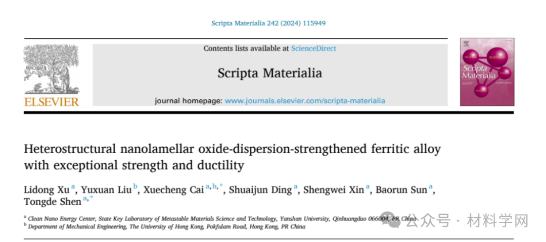 燕山大学《Scripta》:新突破!屈服强度高达 2 GPa,伸长率约 13%!异质纳米结构铁素体合金!