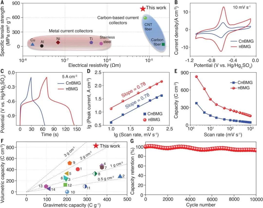 集优异力学性能、轻量化和高密度储能的电极材料是制备柔性储能器件的理想材料,然而目前大部分柔性电极材料的力学性能均无法与传统的集流体媲美。πBMG薄膜的比拉伸强度出高于目前常用商用集流体,适合用作自支撑电极。此外,πBMG薄膜在3MH2SO4水系电解液中体积比容量达到828Ccm-3高于目前文献报道的其他石墨烯基电极材料,为石墨烯基自支撑电极的轻量化、高密度储能提供了重要参考。