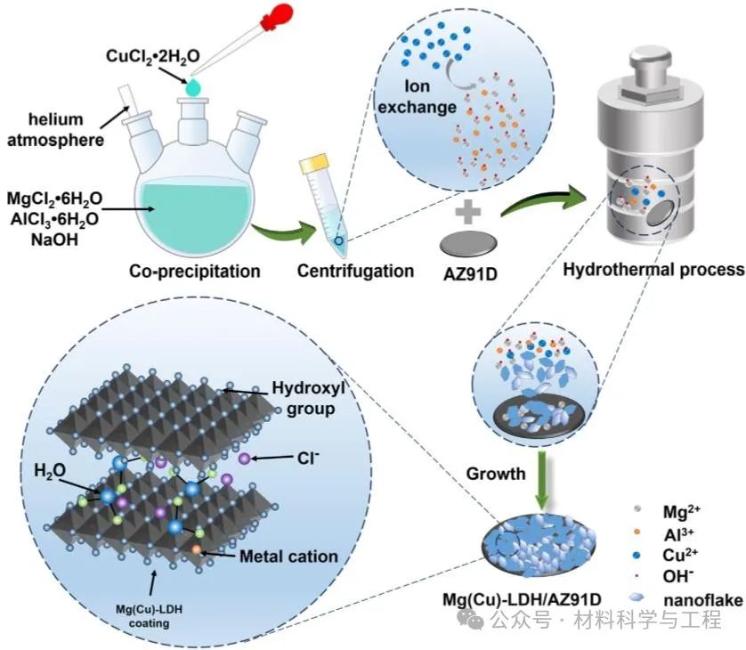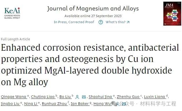 镁合金的密度和弹性模量与人骨接近,具有作为骨科植入物的潜力。然而,镁合金极易发生腐蚀,伴随着植入后细菌感染,常常导致种植失败。因此有必要开发一种具有优异耐蚀性,同时兼具抗菌和促骨再生的新型材料。层状双氢氧化物(LDH)是指两种或两种以上金属元素氢氧化物嵌层组装水滑石层状结构,因其优越的离子交换功能可改善耐蚀性而备受关注。