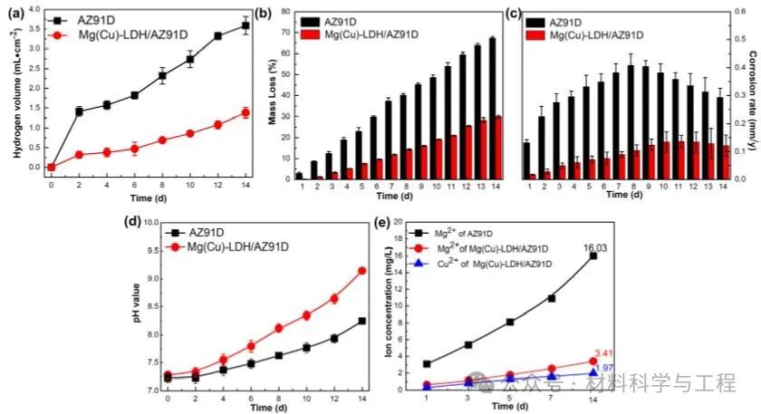 图3 (a) 在PBS溶液中浸泡1、3、5、7 和14天后的氢气释放量;(b) 质量损失率;(c) 腐蚀速率;(d) pH值;(e) Mg2+和 Cu2+的离子释放浓度