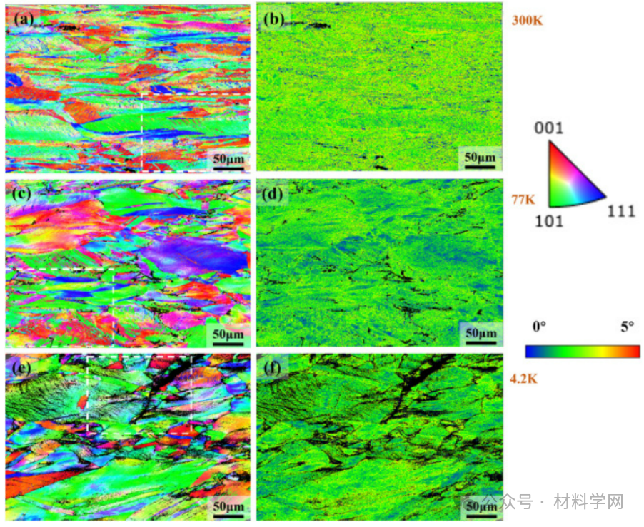 断裂表面附近拉伸试样变形显微组织的EBSD显微图:(a) 300 K时IPF图像,(b) 300 K时KAM图像,(c) 77 K时IPF图像,(d) 77 K时KAM图像,(e) 4.2 K时IPF图像,(f) 4.2 K时KAM图像。