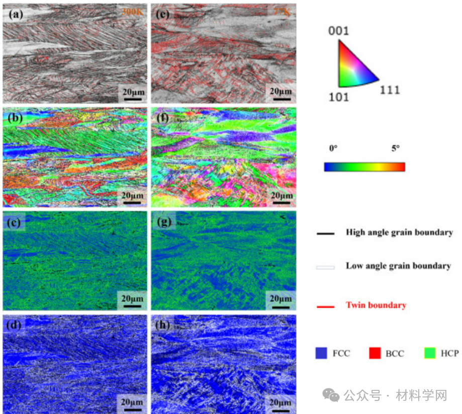 图3(a, c)白色矩形内放大的EBSD图像:(a) 300 K时BC图像,(b) 300 K时IPF图像,(c) 300 K时KAM图像,(d) RT时相位图,(e) 77 K时BC图像,(f) 77 K时IPF图像,(g) 77 K时KAM图像,(h) 77 K时相位图。
