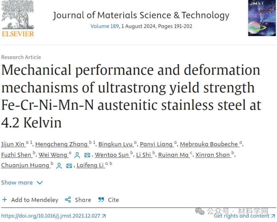 在此,松山湖材料实验室王伟、中国科学院理化技术研究所低温重点实验室黄传军研究团队研究了含V和Nb的Fe-Cr-Ni-Mn-N奥氏体不锈钢。在室温和低温下测试了合金的力学性能,并对合金的变形组织进行了研究。基于力学性能与变形显微组织的相关性,系统分析了Fe-Cr-Ni-Mn-N合金的变形机理,为其作为低温材料的应用提供了科学和工程意义。相关研究成果以题“Mechanical performance and deformation mechanisms of ultrastrong yield strength Fe-Cr-Ni-Mn-N austenitic stainless steel at 4.2 Kelvin”发表在Journal of Materials Science & Technology上。