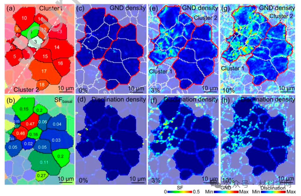 图 7. (a) 从 HT1 样品中选取的感兴趣区域的 IPF 图,以及相应的 (b) 基底滑移的 SF 分布。(c、e、g)标量 GND 密度(单位 ?m -1 )和(d、f、h)标量离散度(单位 rad ?m -2 密度(单位:rad ?m -2 )