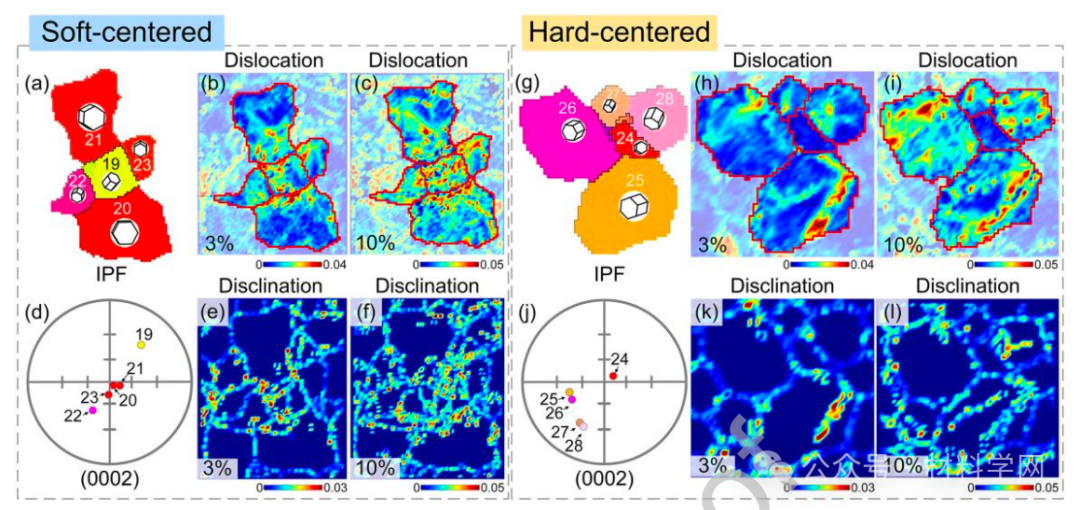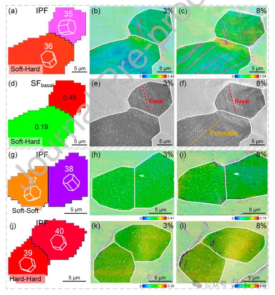 图 12. 显示软硬晶粒对在应变为 3% 和 8% 时不同类型晶粒对之间应变分布 (εxx) 演变的准原位 SEM-DIC 图:(a) IPF 图,(b, c) DIC 图,(d) SFbasal 分布和 (e, f) SEM 图像;软-软晶粒对:(g) IPF 和 (h, i) DIC 图;硬-硬晶粒对:(j) IPF 和 (k, l) DIC 图