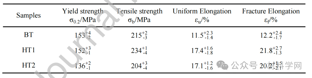 表 2. 室温下测试的 BT、HT1 和 HT2 样品的拉伸性能