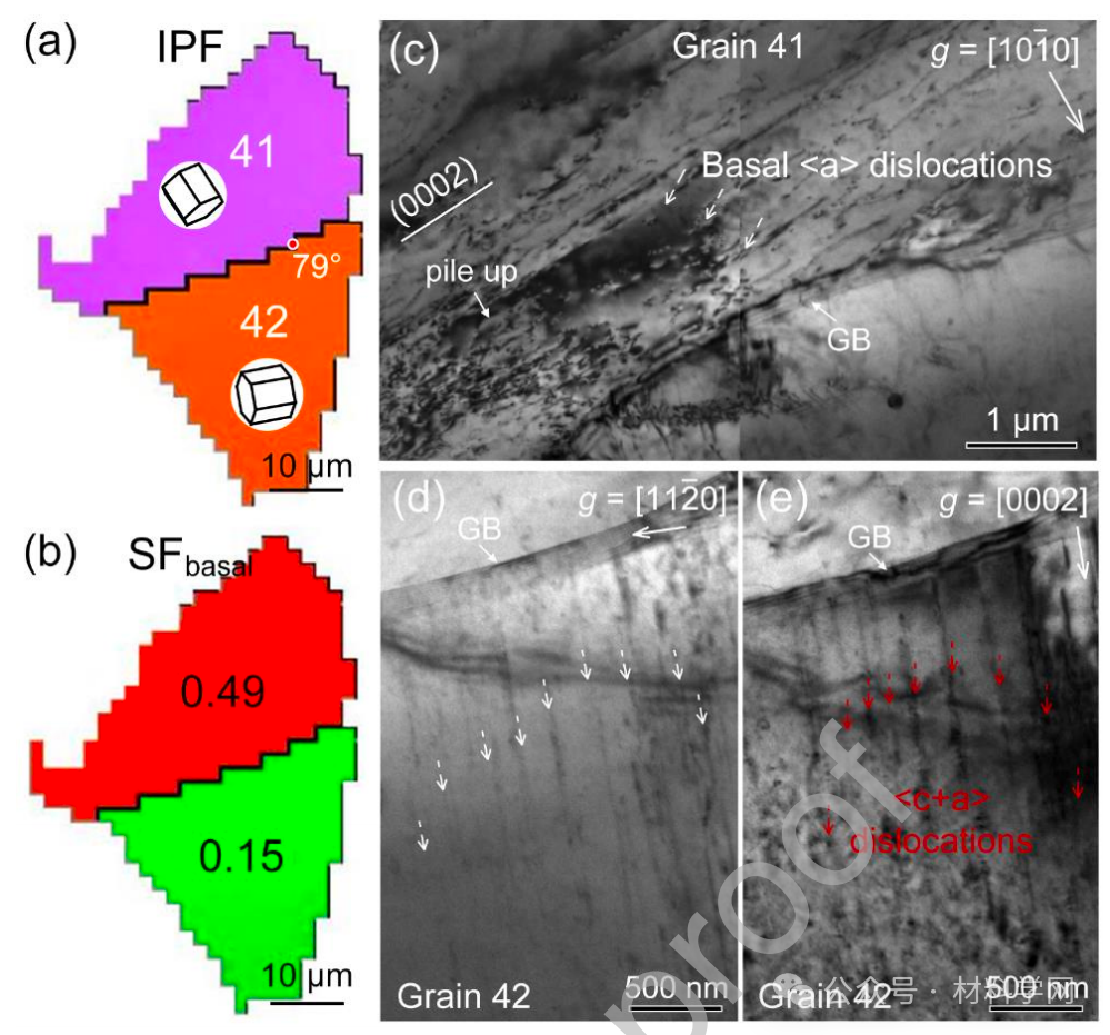 图 13. (a) 3% 拉伸变形后选定晶粒对的 EBSD-IPF 图和相应的 (b)SFbasal 图。(c) 使用 g = [101?0] 时软晶粒 41 的明场 TEM 图像。(d)、(e) 使用 g = [112?0] 和 g =[0002] 时软晶粒 42 的明场 TEM 图像 图 13. (a) 3% 拉伸变形后选定晶粒对的 EBSD-IPF 图和相应的 (b) SFbasal 图。变形。(c) 使用 g = [101?0] 时软晶粒 41 的明场 TEM 图像。(d)、(e) 使用 g = [112?0] 和 g = [0002] 时软晶粒 42 的明场 TEM 图像