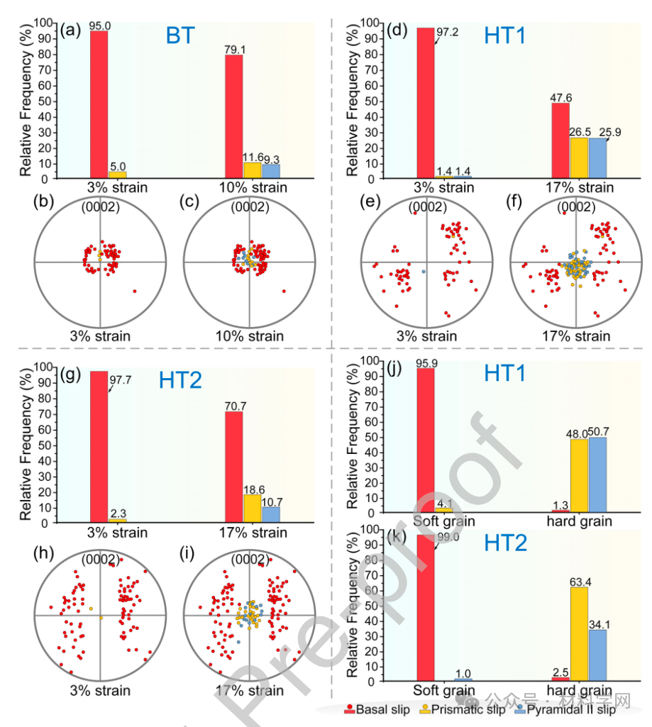 图 6. (a) BT、(d) HT1 和 (g) HT2 样品在初始应变(3%)和最终应变(BT 为 10%,HT1 和 HT2 为 17%)阶段的已识别滑移轨迹频率;(0002) 离散极点图。应变)和最终(BT 为 10%,HT1 和 HT2 为 17%)变形阶段的已识别滑移痕迹的频率;(0002)离散极点图 显示了(b-c)BT、HT1 和 HT2 样品在初始和最终变形阶段涉及不同类型滑移痕迹的晶粒取向。(b-c)BT、(e-f)HT1 和 (h-i) HT2 样品在初始和最终变形阶段涉及不同类型滑移痕迹的晶粒取向;(j) 在 17% 应变下,(j) HT1 和 (k) HT2 样品软/硬晶粒内已识别的滑移痕迹的频率