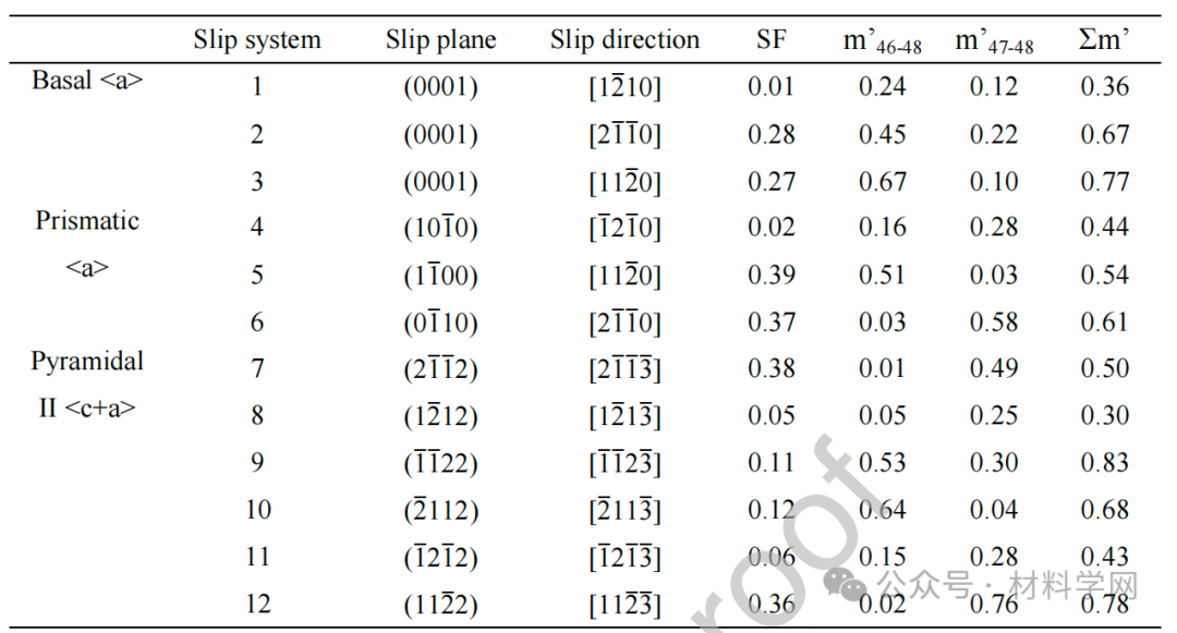 表 3. 谷粒 48 的施密德因子计算值、谷粒 46 和 48 之间的 m'值、谷粒 47 和 48 之间的 m'值以及谷粒 48 的 Σm' 值、 以及晶粒 48 的 Σm' 值。(激活的滑移系统以蓝色标出,SF、 m'和 Σm' 的最高值用红色标出)