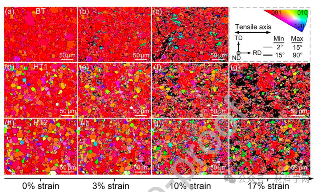 图 3. BT、HT1 和 HT2 样品在单轴拉伸过程中沿 RD 的准原位微观结构演变 (a, d, h) 初始;(b, e, i) ~3% 应变;(c, f, j) ~10% 应变;(g) 和 (k) ~17% 应变