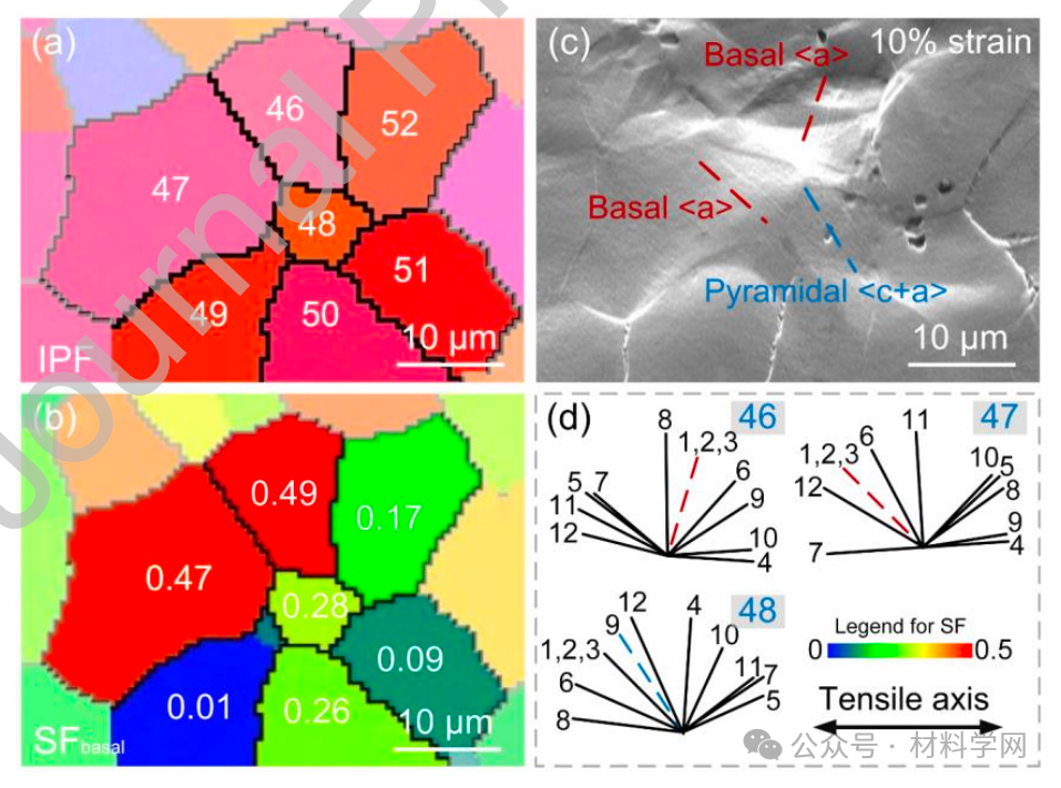 图 15. (a) 感兴趣区域的 IPF 图,(b) 相应的 SFbasal 图,以及 (c) 10%拉伸应变后的 SEM 显微照片;(d)三个选定晶粒的 12 条可能轨迹的计算结果
