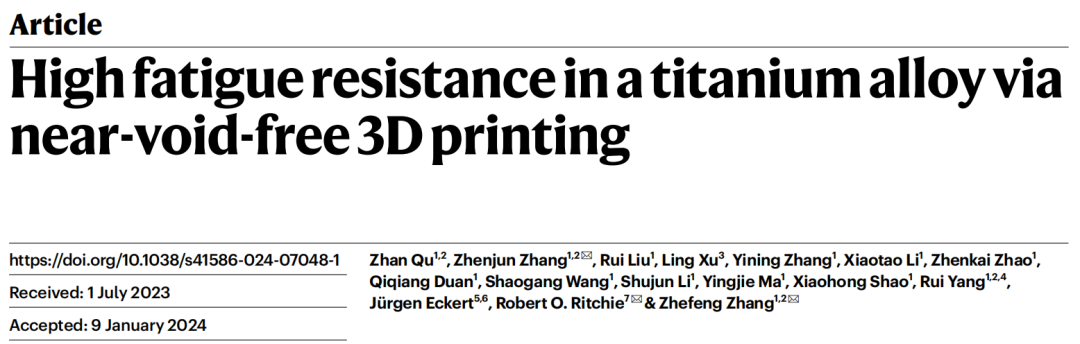 北京时间2024年2月29日,中国科学院金属研究所张哲峰研究员、张振军研究员、杨锐研究员与美国加州大学伯克利分校Robert O. Ritchie教授合作在Nature期刊上发表了一篇题为“High fatigue resistance in a titanium alloy via near void-free 3D printing”(近无微孔3D打印钛合金高抗疲劳性能)的研究成果。 该成果通过发明缺陷与组织分步调控的NAMP新工艺(Net-Additive Manufacturing Process),制备出几乎无气孔的近Net-AM组织Ti-6Al-4V合金,有效避免了从打印气孔、粗大板条及α相富集晶界等多种疲劳短板处开裂,展示出3D打印组织自身特有的高疲劳抗性:其拉-拉疲劳强度高达978 MPa,在目前已报道的所有材料疲劳数据中具有最高的比疲劳强度。 论文第一作者为曲展,论文通讯作者为张振军、Robert O. Ritchie、张哲峰。 3D打印,又名增材制造(Additive manufacturing,AM),因其得天独厚的自由成形能力极大地满足了高端装备和构件对高集成性、多功能性、轻量化、一体化的需求,被认为是制造领域的颠覆性技术。因而,3D打印材料在航空航天等领域得到极大关注和初步应用。然而,与传统制造技术相比,3D打印制备的材料在循环载荷下的疲劳性能普遍较差,严重制约了其作为结构承力件的广泛应用。因此,如何提升3D打印材料与构件的疲劳性能是国内外学术界与工程界热切关注的焦点问题。 这项工作中,张哲峰团队首次明确提出:理想状态下3D打印技术直接制备出的钛合金组织本身(称为Net-AM组织)应具有天然的超高疲劳性能,而打印过程中产生气孔等缺陷作为疲劳短板掩盖了其自身组织抗疲劳的优点,导致实际测量的3D打印材料疲劳性能往往大幅降低。因此,提升3D打印材料疲劳性能的关键在于消除打印气孔的同时,尽可能保留原始打印的组织状态。然而,目前消除气孔的工艺往往伴随组织粗化,而细化组织处理又会带来气孔复现,甚至引发易于疲劳开裂的晶界α相富集等新的不利因素,可谓进退两难。幸运的是,张哲峰团队在Ti-6Al-4V合金中首次发现:3D打印态组织在高温下相转变、晶界迁移与气孔长大过程具有异步特性;这意味着存在一个宝贵的热处理工艺窗口,既可实现板条组织细化,又能有效抑制晶界α相富集及气孔复现。为此,他们巧妙地利用了这一工艺窗口期,发明了缺陷与组织分步调控的NAMP新工艺(Net-Additive Manufacturing Process)(图1),最终制备出几乎无气孔的近Net-AM组织钛合金。