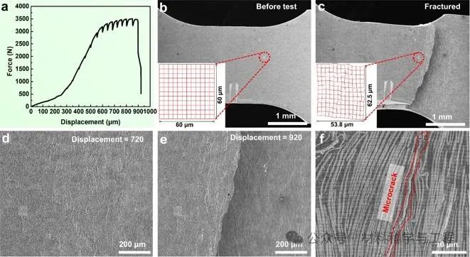 SAL W-Cu复合材料高塑性的来源,一方面归因于自组装多级层状结构诱发的可持续的位错增殖能力,另一方面归因于该独特结构诱发的微裂纹缓冲效应。开展的原位压缩测试研究表明,在塑性变形的后期SAL W-Cu中产生了大量的微小裂纹,这些微裂纹沿着钨铜相界面扩展,与最大剪切应力方向大约呈45度,并不发生快速扩展形成主裂纹而导致复合材料断裂失效。恰恰相反,这些微裂纹的形成有效释放了局部的应力集中,促进了复合材料在整体范围内均匀的塑性变形,从而促进了复合材料整体塑性的提高。此外,这种独特的层状结构和钨相的高强度也增大了主裂纹产生所需的临界应力,进一步延缓了复合材料的断裂。