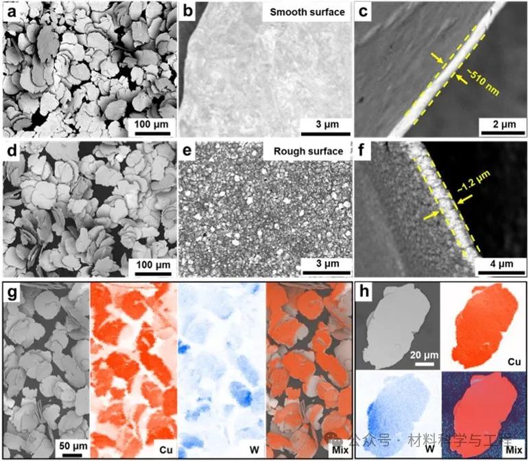 图3 a-c,预处理获得的钨片形貌;d-h,镀铜钨片的形貌及元素分布。
