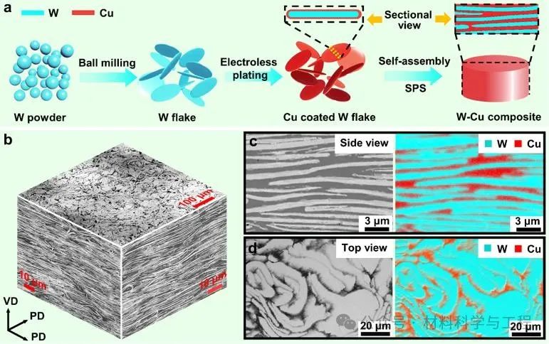 钨铜复合材料是由不互溶的钨和铜构成的一种独特的双金属复合材料,在高压电触头、电加工电极、电子封装、核聚变、电磁推进等领域具有广泛的应用。随着科技发展和新应用领域的拓展,钨铜部件的服役环境越来越严苛,对其综合性能提出了更高的要求。而通过熔渗法等制备的传统钨铜复合材料,其粗大的组织结构和较低的力学性能严重限制了其高端应用。近年来,研究者主要利用细晶强化、第二相强化或合金化等方法提高钨铜复合材料的强度。然而,溶质原子、第二相以及晶界、相界等内界面的引入,不仅导致钨铜复合材料塑性严重恶化,还大大增强了电子散射,降低了钨铜复合材料的传导性能。因此,如何使钨铜复合材料同时具有高的强度、塑性和电导率,是领域多年来共同关注和亟待解决的关键问题。