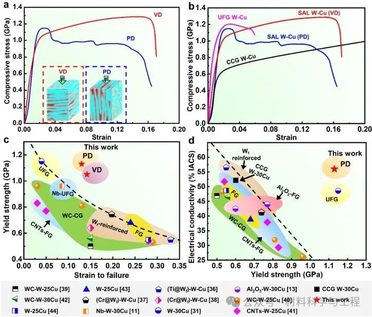 首先,作者构建了有限元模型针对不同构型特点的钨铜复合材料的力学、电学和热学响应特性进行了定量化研究。发现钨铜复合材料的强度不仅受钨相自身的强度影响,还强烈地受钨铜两相构型特征的影响。如果某一构型中钨相的载荷配分比例较低,则钨相自身的高强度优势不能充分发挥,复合材料的强度水平有限。只有在实现钨相自身高强度的同时保证钨相在复合材料构型中具有高的载荷配分能力,才能充分发挥钨相高强度的优势,最终获得钨铜复合材料的整体高强度。同时,为了兼具高的导电导热性能,还需要独特的降低电子散射、利于电子快速输运的结构设计。为此,研究团队提出创新的自组装层片结构多层级设计理念,形成SAL结构(“self-assembled lamellar architecture”)的钨铜复合材料,记为SAL W-Cu。作者通过预处理制备了产生有高密度位错的超细晶高强度钨片,随后利用化学镀方法对钨片表面进行了均匀的铜层包覆,再利用自组装效应和短时快速烧结技术实现了致密SAL W-Cu的制备。研制的SAL W-30Cu复合材料表现出高达1.13 GPa的压缩屈服强度(约为同等测试条件下常规粗晶钨铜合金的两倍)和56 %IACS的电导率(高于导电性最好的商用粗晶钨铜合金),同时,SAL W-30Cu复合材料具有高达14%的塑性变形能力。