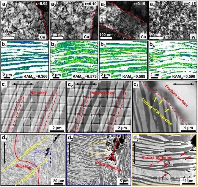 图7 a,SAL W-Cu复合材料在不同应变下铜相和钨相中的位错密度观察;b,SAL W-Cu在制备态和断裂后的铜相和钨相中的KAM分布;c1-c2,准原位压缩过程中沿相界面的微裂纹;c3,SAL W-Cu断裂后主裂纹切过多个钨层片;d,SAL W-Cu沿PD方向压缩在应力下降发生后的微观组织特征:钨片层的屈曲和裂纹偏转、钝化、缓冲效应。