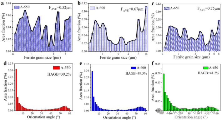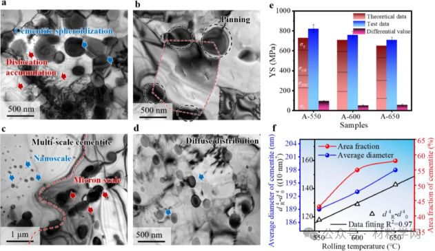 工程材料中一个微小的结构缺陷都可能带来相当大的局部应力集中,从而可能导致灾难性的破坏,造成重大的生命和财产损失。因此,有效缓解局部应力集中是材料设计中的一项重要任务。在金属材料的成分设计和冶金生产过程中,经常会形成与基体弹性模量有显著差异的夹杂物或次生相。当外部应力导致位错移动时,位错往往会聚集在高能位置,形成一些微孔(裂纹源)。微孔处存在三向应力集中,通常会在应力作用下扩展并合并成凹陷或微裂纹。Wang 和 Zhang发现微裂纹的尖端容易引起局部应力集中,裂纹沿晶界或在晶粒内逐渐扩展。由于缺陷能量较高,晶界更容易被撕裂,从而形成断裂面。为了延缓晶界和晶粒内部的失效,Yan 等人采用循环应变模式在镁合金中设计了合理数量的晶界和孪晶界。虽然这在一定程度上平衡了材料的强度和塑性,但抑制应力集中和裂纹扩展的效果并不显著。Huang 等人提出了位错工程理论,通过在高强度马氏体中积累超高密度的位错,可以缓解应力集中并改善材料塑性。马氏体中积累超高密度的位错,从而缓解应力集中并改善材料塑性。然而,这种方法对材料的强度和位错的最大容量要求过高,而且需要突然激活位错。我们在以往的研究中发现了一个有趣的现象,即当存在多个次生相时,相邻应力场会带来相互促进的耦合强化,而强化效果与次生相的分布和形态有关。目前,关于如何充分利用第二相的强化效应来缓解金属材料应力集中的研究仍处于早期阶段。 近年来,仿生工程 已成为材料设计中一种前景广阔的方法。在材料设计中大有可为。Wu 等人从螳螂虾的身体结构中汲取灵感,设计出一种仿生微结构,显著提高了材料的吸能性能。同样,Shi 等人开发了一种仿生鱼骨状微结构,以限制裂纹扩展路径。目前已开发出多种仿生结构,如仿蜂窝结构、仿软体动物结构、仿投手植物结构、仿鲨鱼盾鳞结构等。然而,这些仿生项目仍处于早期阶段,需要进一步开发才能实现产业化。关键是要开发出与冶金钢铁工业现有设备兼容的新型仿生金属材料加工技术。竹纤维的天然结构由纤维素、半纤维素和木质素组成,表现出复合、多相和异质结构的特点。纤维束由不同长度的实质细胞形成。纤维壁呈现异质微观结构,从外层到内层的厚度各不相同。竹子的这种纤维异质结构有助于提高其强度和韧性。受天然竹子结构的启发,我们开发了一种具有模仿竹纤维的异质结构的中碳钢,利用多种强化机制。利用异质边界和胶结物的耦合构建点线拓扑结构,有效传递应力并缓解应力集中,从而在保持优异塑性的同时显著提高屈服强度。有关此课题,华北理工大学联合悉尼大学廖晓舟教授进行了深入研究,相关研究成果以“Strong yet ductile bionic steel by mitigating local stress concentration function”发表在“Journal of Materials Science & Technology”上 https://www.sciencedirect.com/science/article/pii/S1005030224001774?via%3Dihub图 1. 初始普通碳钢(a)和预处理后(b)的微观结构。图 2. 热轧和退火后假共晶样品的微观结构和机械性能 轧制和退火后的微观结构和力学性能。(a)天然竹纤维结构图。(b-d)分别是在 550、600 和 650 °C 下轧制的样品。其中 F 代表铁素体,PF 代表原共晶铁素体,EF 代表共晶铁素体、 θ 代表胶合铁素体曲线,(f)屈服强度-均匀伸长率比较。轧制方向称为 RD,与轧制工具接触表面的法线方向称为 ND,而 TD 表示与其余两个方向垂直的方向。 图 3. 仿生钢在轧制和退火过程中的铁素体晶粒尺寸信息(a-c)和取向差演变(d-f)。图 4. 竹纤维复合材料中碳素结构钢的精细表征和结构参数统计。(a) TEM 发现样品的微观结构中存在大量位错,且雪明碳酸盐已明显球化。(b) TEM 观察结果表明,大尺寸的雪明碳酸盐很容易聚集在晶界处,从而对晶界产生针刺效应。对晶界产生了钉扎作用。(c、d)通过 TEM 观察到,铁素体晶粒内部析出了纳米级的雪明碳酸盐。在 A-600 样品的铁素体晶粒内部析出,而其他位置上的雪明碳酸盐尺寸较大(c),形成了多尺度的雪明碳酸盐分布特征,而且雪明碳酸盐的分布更为分散(d)。(e) 用金属材料线性强化理论分别量化了奥罗旺强化机制(σC)、晶界强化机制(σGB)、位错强化机制(σdis)和 HDI 强化机制(σHDI)对屈服强度(YS)的贡献。(f) 利用 TEM、Image Pro 和 EBSD 计算雪明碳酸盐的面积分数和平均直径,发现雪明碳酸盐的分布 (