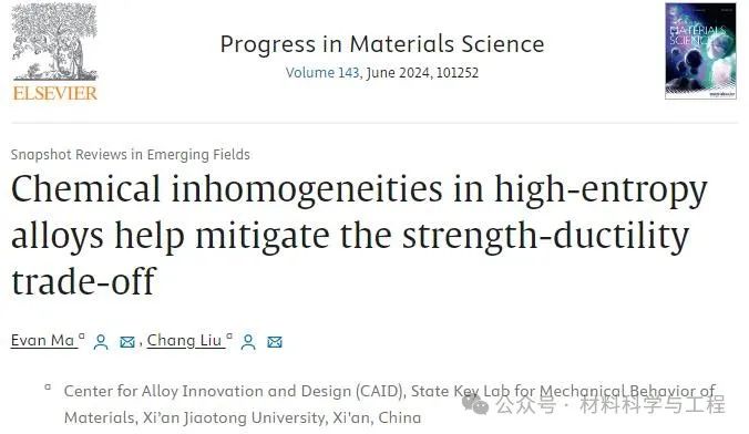近日,西安交通大学金属材料强度国家重点实验室马恩教授和刘畅教授对高熵合金中这种非常规的化学不均匀性进行了全面的阐述。该工作以“Chemical inhomogeneities in high-entropy alloys help mitigate the strength-ductility trade-off”为题发表在国际材料顶级综述期刊Progress in Materials Science (IF=37.4)。西安交通大学金属材料强度国家重点实验室材料创新设计中心(CAID) 为论文唯一单位。该研究得到了国家自然科学基金委及国家青年人才计划的支持。