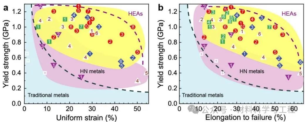 图1 金属合金的拉伸屈服强度 versus 均匀延伸率(a)和断裂延伸率(b):浅蓝色区代表传统金属;粉红色区域代表纳米异构金属;黄色区中的高熵合金(不同颜色代表不同晶体结构的HEAs)带来了许多“又强又塑”的新金属材料,并表现出向着图中右上角方向铺展的明显趋势。而右上角方向代表着人们长期以来追求的目标:“既有高强度合金具有的GPa级屈服强度、又有与单质金属媲美的大(~50%量级)延伸率”。