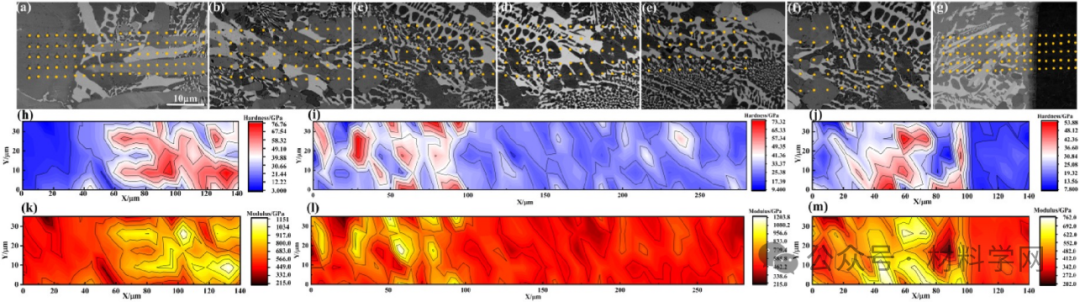 图17. (a–g) 在1100°C/10分钟下采用(Ti21.25Zr25Ni25Cu18.75/Zr25V6.25Cu50Ni18.75) GAFM钎焊的K4169/TiAl接头纳米压痕测试点的位置;(h–j) 硬度云图;(k–m) 弹性模量云图。