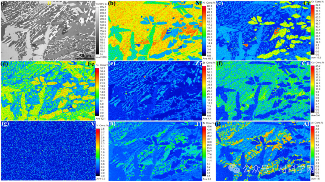 (3) GAFM中的V元素导致了Zone II中无明显优选取向的晶粒转变为呈网状覆盖特征的晶粒,其中,网状覆盖的ZrNi3晶粒具有<223>优选取向,而网状覆盖的Niss + TiAl晶粒具有<131>优选取向。与此同时,该区域晶粒的最大尺寸从62.7 μm减小至52 μm,KAM值更加均匀分布,网状覆盖的ZrNi3晶粒中位错密度更高,有助于将次结构化晶粒的比例从46.6%增加至56.4%。